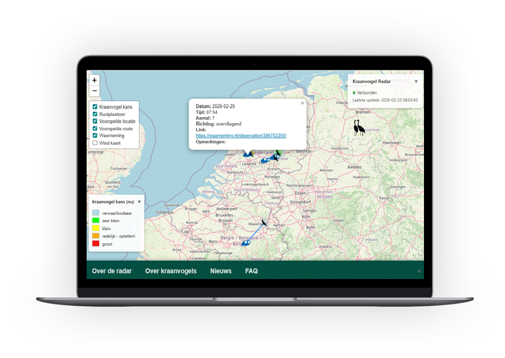 Thousands of birders in the Netherlands, Belgium, and Germany use Waarneming.nl to record crane sightings. We have developed a model that combines these observations with current weather data, over 20,000 historic sightings, and our knowledge of the species’ biology and ecology. This creates a real-time radar showing current crane sightings and their expected migration routes.